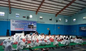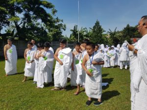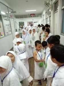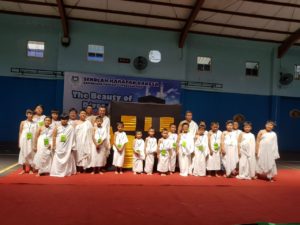 Hajj pilgrimage activities led by ustadz Medio started from Miqot Makani at school while bertalbiyah towards the gymnasium and all students wore ihrom clothes. After arriving at the gym, tawaf was performed (surrounded the kakbah) seven times, then Sa'I (jog) 7 times from Bukit Safa to Bukit Marwah, after throwing Jumroh and wukuf with prayer together led by Mr. Ustadz . After they finished the sanctuaries studetnts drank the zamzam water and returned to school.