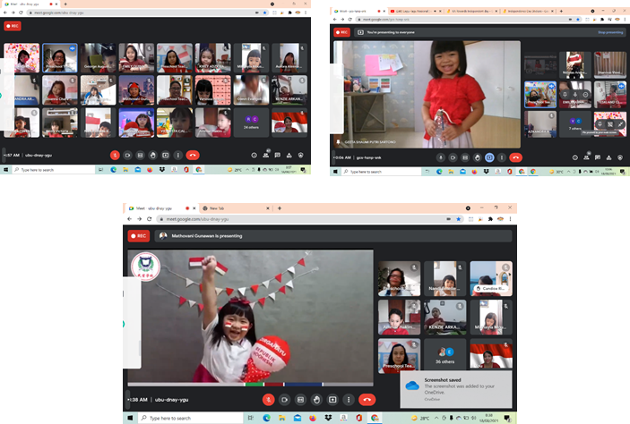 首先,所有幼儿园的学生一起聚在统一的链接演唱印度尼西亚国歌,观看独立宣讲者苏加诺 – 哈达的传记影片以及一些学生的幻灯片。他们很热心的参加有关印度尼西亚独立日的问答环节,如:印度尼西亚国旗的颜色是什么,印度尼西亚的国徽是什么等等。