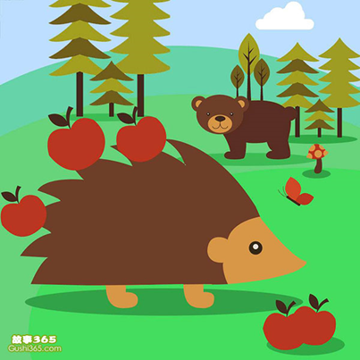 小刺猬走出家门,来到一个果园。他看见果树上结满了又大又红的果实,好像挂了一树的红灯笼。小刺猬心想:这应该就是我要找的食物吧。他跑到一棵果树下,“噌噌噌”爬上树,拽下一个来,闻了闻,好香;咬一口,好甜啊,真好吃!于是小刺猬抱着一根果枝,使劲儿摇晃着,扑通、扑通,又大又红的果实落了一地。小刺猬心想:这么多果实我怎么拿回家啊?他想啊想,终于想到了一个好办法,于是,他在地上打了几个滚,红红的果实便扎了满身。小刺猬高高兴地背着果实回了家。小刺猬的爸爸、妈妈一看,高兴地说:“这才是我们最爱吃的苹果呢。”小刺猬听了,开心地笑了起来。
