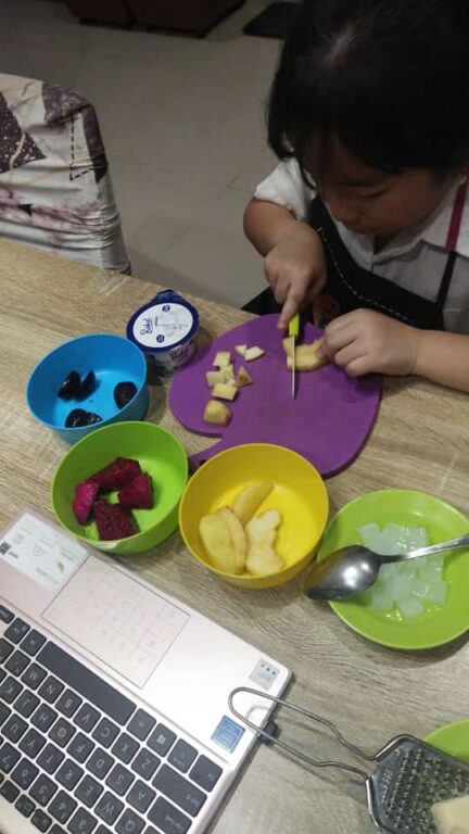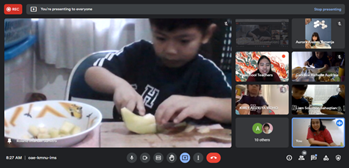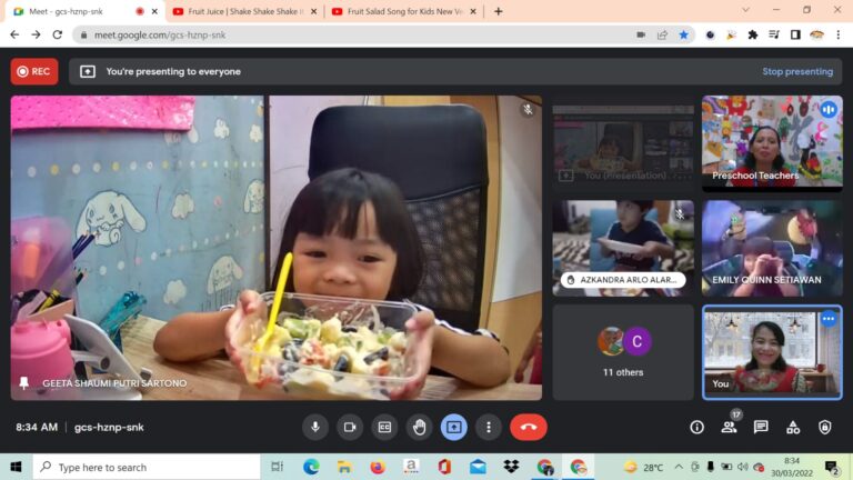 The event started by singing a few songs about fruits and then continued with information about the activities that will be done. After that, the teacher began to introduce the names of fruits and the ingredients used to make fruit salad and showed them to the children. The activity was continued by making fruit salad together online. In this activity, For KA, the class teacher asked the parents to prepare the required materials such as; the fruits already cut cube size, grated cheese, and other ingredients. Then for the KB class, the teacher asks parents to prepare the same ingredients, only for KB the teacher gives the opportunity for children to be able to use a knife to cut fruit into cubes, and grate the cheese themselves, of course with assistance from adults in their respective homes. With the teacher's instructions, children are allowed to make their own at home.