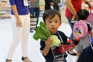 于上午9.00,学生们准备进入超市。他们根据小组很整齐的排队,并跟随老师进入超市。老师们班孩子们拿着菜篮。小小班及小班2的学生参观蔬菜区,而小班1的学生参观水果区。首先,老师们介绍给孩子们各种各样的蔬菜及水果。之后,学生们自己选择蔬菜及水果放入菜篮。有些蔬菜及水果需称重后才能知道价格。所以,他们就到称重区把蔬菜及水果称重。服务员很乐意的招待这些可爱的小孩子们。
