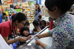 The teacher then directed the students that were finished shopping to go to the cashier to pay for their things. They lined up in a group and gave the things they wanted to the Cashier. The teacher then gave some money to them. Each student had Rp.30.000,- to pay for all the things they bought. They tried waiting patiently to have their turn. We took a picture to