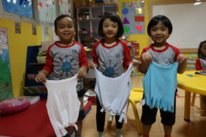 Acara selanjutnya, Siswa terbagi menjadi 2 group besar. Group pertama adalah Siswa TK. Seluruh Siswa TK mulai dari KC – KB melakukan daur ulang dari bahan – bahan yang sudah tidak terpakai seperti :