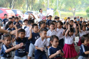 We gather at 08.00 a.m, then we warm up, after that we have the main activity for 15 minutes. All students are always excited with the movements. They had a great happy dance with all of their friends following one teacher as the instructor.