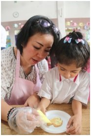 The students experienced how to be a baker for a day by decorating a cupcake and cookie. After the children pay attention enthusiastically to the explanation and brief demonstration from our guest, the children were very excited to decorate their own cupcake and cookie independently. The students decorated it with yummy and colorful icing with sprinkles.