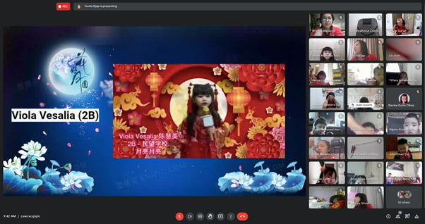 于2021年9月21日(星期二),现代城民望学校小学部举办中秋节庆典。本活动以线上方式进行。学生们穿上红色衣服很积极的参加活动。本次活动的目的是为了给学生们介绍中华文化并培养学生们对其他文化的互相尊重的态度。