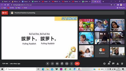 Pada perayaan bahasa Indonesia siswa/i TK Harapan Bangsa bergabung di link google meet masing-masing kelas. Mereka mendengarkan cerita yang dibawakan oleh seorang pendongeng sekaligus ventriloquist yaitu Kak Budi dengan judul “Tular Menular”. Para siswa sangat antusias mendengarkan cerita yang ditampilkan dengan menggunakan pop-up book. Selain itu ada juga pertunjukkan menggunakan boneka dengan ciri khas dan karakter yang berbeda-beda.