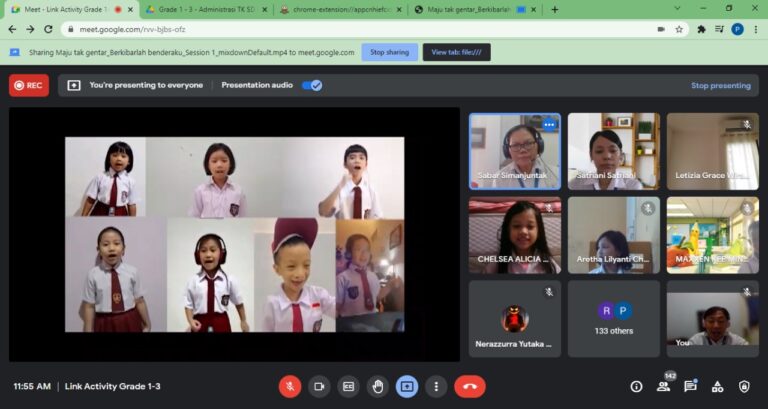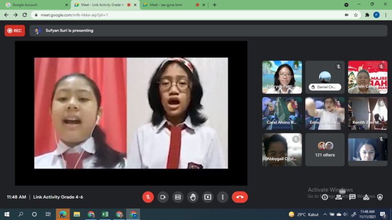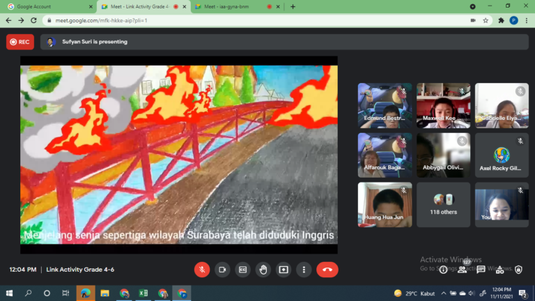 The activity took place in two Google classrooms, namely Group 1 and Group 2. Group 1 is comprised of students from of grades 1 to 3 whereas Group 2 was comprised of students from grades 4 to 6. The activity was held from 11:30 to 12:30. The event began with the opening by the MC, the opening prayer by the students, a welcoming speech by the school principal followed by the main event which is watching the Cardboard Puppet Show that tells the Story of the Battle of November 10, 1945 in Surabaya.