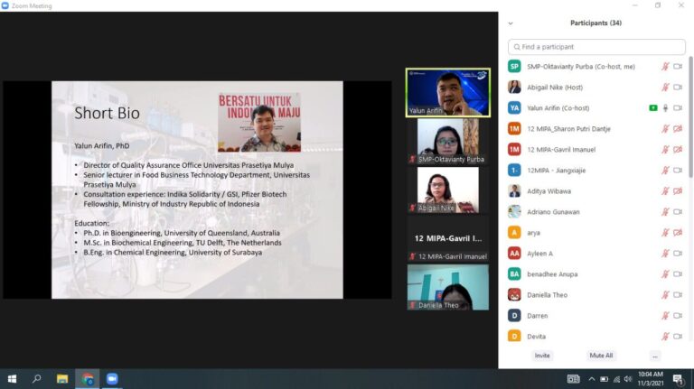 因为疫情尚未结束,所以本活动不能在学校面对面的进行。民望学校尽可能的提供优质的线上学习,其中一个方式就是邀请了一位在他的学科领域称职的客座教授。这位教授名叫Yalun Arifin, Ph.D, 来自Prasetya Mulya大学的生物技术的教授。希望学生们在未来通过不同学科,对课堂正式学习材料与其在日常生活中的应用之间的关系有一个概述和丰富的理解。