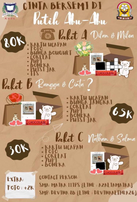 情人节到了!情人节这一天人人以问候语和礼品对亲人表达爱意。情人节就是恩爱的庆典,也就是人们对爱人表达感情表示钦佩的时刻,情侣之间感到特别的时刻,用温暖和亲情沐浴彼此。也就是朋友用食物、鲜花、巧克力等礼品招待他人的时刻。情人节这一天,无论是朋友还是情人,人们通常在外闲逛。但由于“奥密克戎”毒株病例不断地增加,所以不是聚会的好时机。然而,这并不意味着我们也不能庆祝这个特殊的日子。民望学校初高中学生会准备了一些以复古风格或90后的爱情为灵感的特别情人节套餐。我们制作了几个包装,其中的礼物和设计灵感来自于复古主题的青少年浪漫电影。我们选择了这个主题,以让青少年仿佛在电影中。尤其是目前较流行的“复古”浪漫电影和书籍,如被大部分青少年所喜爱的“Dilan与Milea”、“Galih与Ratna”。今年我们提供的套餐有三个:“Dilan与Milea”、“Rangga与Cinta”以及“Galih与Ratna”。当然,礼物中的礼品与情人节主题息息相关。今年2月14日情人节,除了民王学校学生,还有来自其他学校的学生也都订购了所有的礼物套餐。有的礼物由学生会成员直接送到朋友的地址或顾客的地址,有的礼物经过Gojek手机客户端送到指定的地址。所有礼物套餐经过精心安排并运送到目的地。这样他们仍然感受到情人节的气氛。我们在星期一下午把礼物套餐分发。当天完成学校网课后,我们立马安排礼物套餐和派送。我们把客户之作的信件放入套餐里,再安排派送。当我们派送礼物套餐时,有些学生感到惊讶,因为没想到会打收到情人节礼物套餐。有些人感到高兴。还有些人对订购礼物套餐的寄件人感到好奇。总之来说,今年的情人节过得很开心。我们也希望受到礼物套餐的每个收件人享受情人节。
