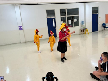 Wednesday, June 15, 2022 saw the activities for grades 1, 2 and 3. On this occasion, Ms. Endang invited students in grades 1 and 2 to sing together and play games. To enliven the event, Ms. Endang invited 3 students to come forward to dance. The students were Gabriela (1A), Felicia (1B) and Rosanoti (2B) wearing cute chicken-themed costumes. Together with other students they danced to the Chicken Dance and Baby Shark movements.