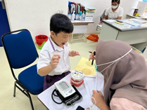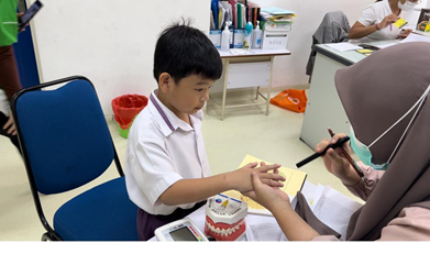 接着,为小孩子们介绍如何正确刷牙的方式。小学一年级A班,B班,C班的学生根据他们班级名单轮流到学校的诊所接受麻疹及风疹的免疫注射。
