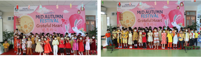 这也是家庭团聚的时刻,有点像感恩节。 中国人通过聚餐、拜月、点灯笼、吃月饼等方式庆祝。 今年小学的中秋节活动于 2022 年 9 月 21 日星期三在两座教学楼举行。 1-2年级和幼儿园的小朋友们在SHB 5教学楼参加活动。3-4年级和5-6年级的学生轮流在SHB 4教学楼大厅参加活动。 本次活动节目种类繁多,有不少学生参加了表演和比赛。