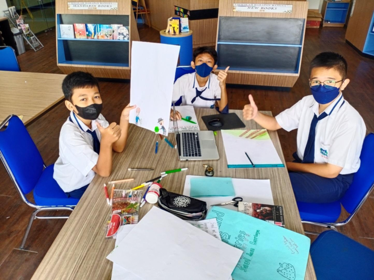 JUNIOR AND SENIOR HIGH SCHOOL MODERNHILL, 28 OCTOBER 2022 青年誓言庆典的准备工作于 2022 年 10 月 24 日开始。学生被分成每组 5-6 人的小组。每个小组都将参加比赛,为孩子们制作一个大的故事书。已组建了34个小组,制作时间为2022年10月24-28日。制作故事书还有一个要求:使用A3纸,内容10页,使用短句。孩子们容易理解,故事由有趣的图片组成。故事用印尼语、英语和汉语三种语言来写。故事的主题是来自当地、国外的儿童故事或他们自己的原创故事。在故事中必须有积极的意义。制作完成后,将评选出初中部一、二等奖和高中部一、二等奖。