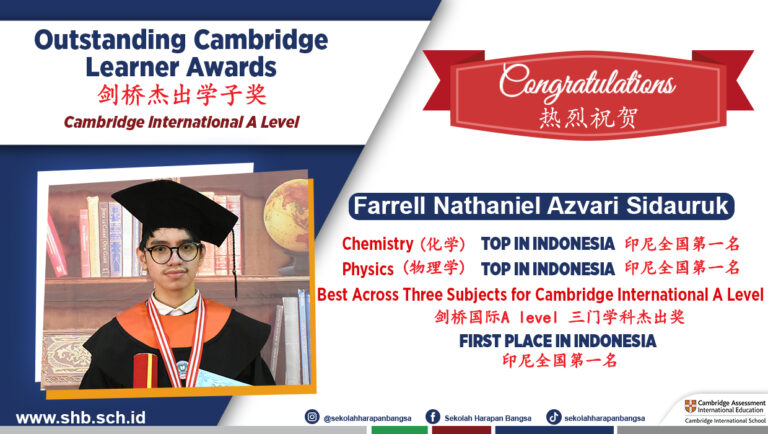 第一位获奖者是 Farrell Nathaniel Azvari Sidauruk,他于 2022 年 6 月完成了剑桥大学预科二年级 (Junior College 2 简称JC 2) 的剑桥国际 A Level 考试。 他在化学和物理方面获得了印尼第一名的殊荣,而另一个奖项是印尼三项第一名,颁发给在特定科目中获得最高累积总标准分的考生。 Farrell 现在就读于著名的香港科技大学(HKUST,HK)数学学位。