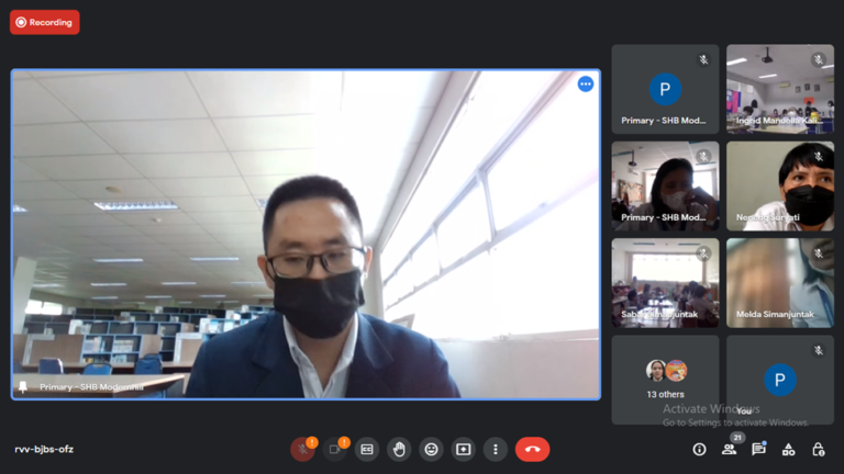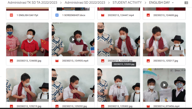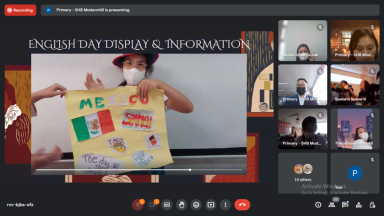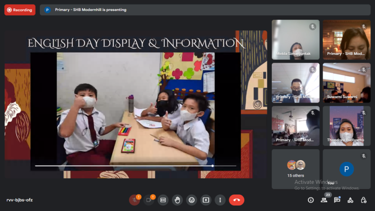 Ibu Theodora Rudyanto, S.Psi., M.Psi. selaku kepala sekolah SD memimpin siswa dalam membaca Pancasila. Sebelum mendengarkan pidato inspiratif tentang toleransi yang disampaikan oleh Ibu Melda Simanjuntak, S.S., M.Hum., para guru bahasa Inggris secara singkat menginformasikan tentang proyek yang diadakan di setiap kelas, dilanjutkan dengan memberikan kesempatan kepada beberapa siswa untuk memberikan presentasi singkat tentang proyek tersebut. mereka melakukannya di kelas. Seluruh proses dan hasil karya siswa kemudian ditampilkan dalam video berdurasi lima menit.
