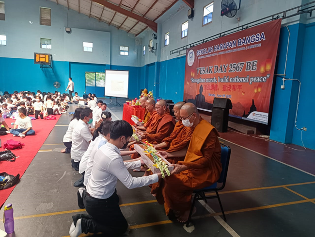 In order to celebrate the 2573 BE Vesak Day, Sekolah Harapan Bangsa Modernland , Primary School held a joint Vesak celebration from kindergarten to junior high school and was also attended by the parents of the students.