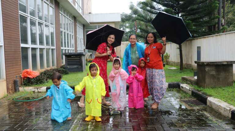 The classes conducted various activities. The teachers decorated some of schools rooms to become very interactive and fun to made the students learned about four seasons. Students do mush activities such as created colorful flowers stamp to represent spring using soda bottle, paint and brush, on provided worksheets. They played under the artificial rain with raincoat and umbrellas in autumn, played on the artificial snow with winter coat, and also played with sand beach, bubbles, beach ball in summer school area,