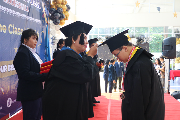 六年级学生的毕业典礼是一个特殊而又充满幸福的时刻,见证着学生们顺利完成了六年的小学教育。 2024 年 6 月 5 日星期三,民望学校现代山庄小学以“大胆、勇敢、尽力而为”为主题庆祝六年级学生的毕业。此次活动是学生升入初中阶段的第一步。六年级学生毕业典礼顺利、热烈地举行。活动期间,张景彪先生作为民望学校基金会的代表,用汉语致辞,Melany Kusumawati Gigir女士用英语、Mediana女士用印尼语陪同致辞。 2023/2024 学年学术、英语和印尼语最佳学生奖授予了 Kenn Alvaro Rumbo。