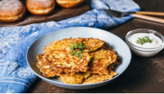 Latkes, or potato pancakes, are a traditional dish for Hanukkah. Deep fried and served with sour cream